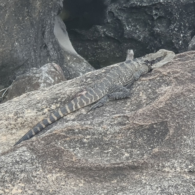 This lizard is basking in the sun near the rocks on the high coast of some eastern suburb of Sydney. Within the bushes we once discovered a species of very small bird, the size of a hummingbird but different.